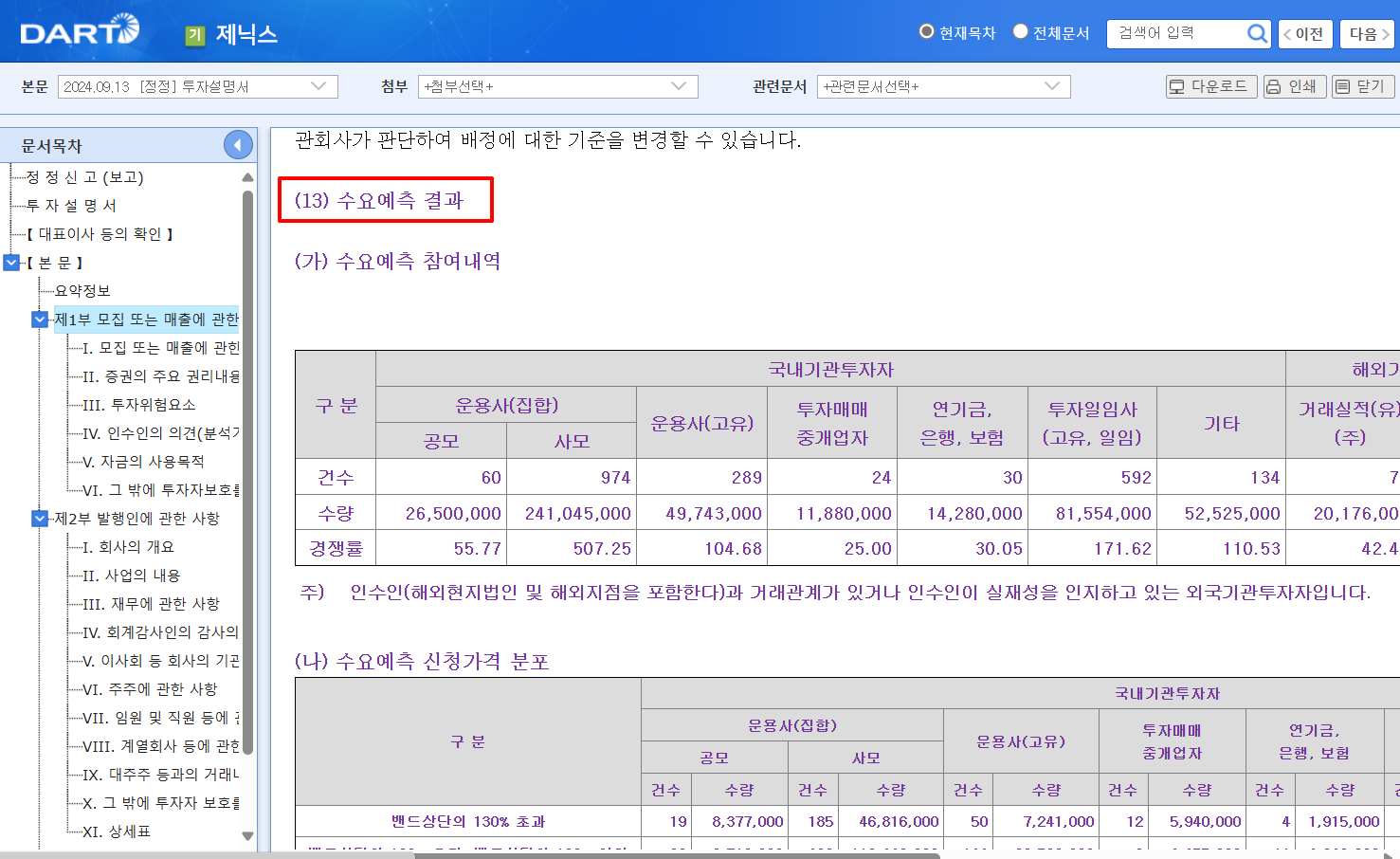 - 수요예측에 참여하는 기관 투자자들은 투자 은행이나 자산 운용사 같은 전문 투자 기관들이며, 이들은 각자의 분석을 바탕으로 해당 기업의 성장 가능성, 재무 상태, 사업 모델 등을 평가합니다. 따라서 수요예측 결과는 이러한 기관들의 전문적인 평가와 시장 기대치를 반영하는 중요한 지표입니다.
