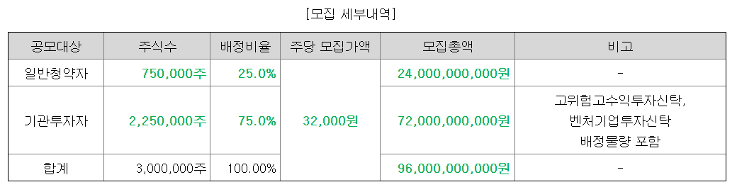 - 총 공모 주식수 : 3,000,000주 (신주 모집 100%)