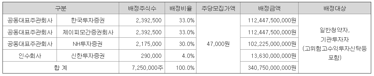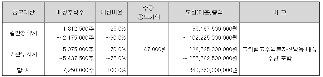 - 총공모 주식수 : 7,250,000주 (100% 신주발행)