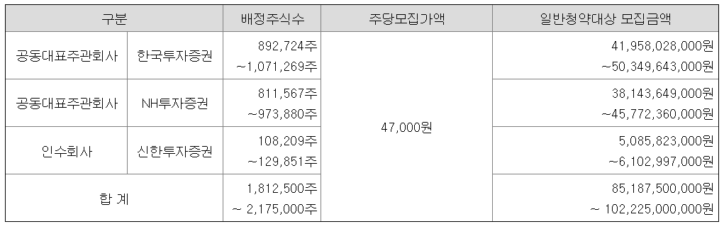 - 최소청약증거금 : 235,000원 (희망공모가 하단 47,000원)