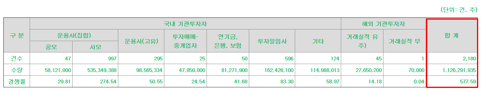 기관경쟁률 577.59:1 기관참여 2,180 의무보유확약비율 0.99% |