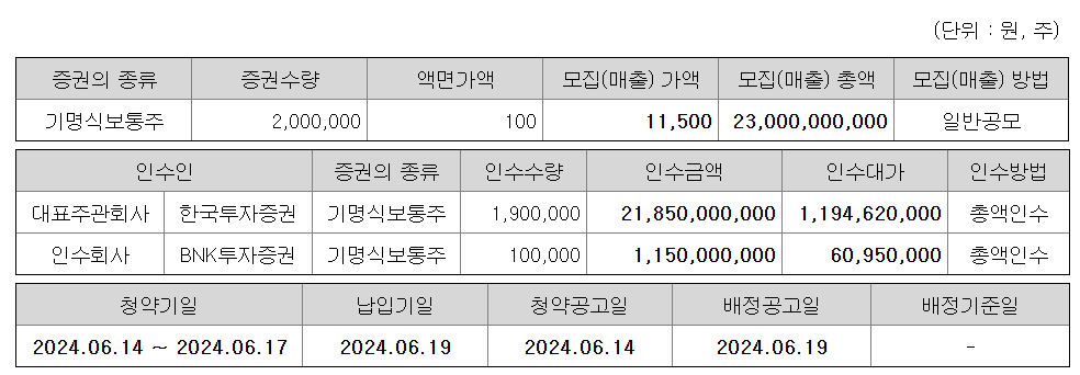 대표주관사는 한국투자증권이고, 인수사는 BNK입니다.
