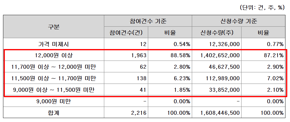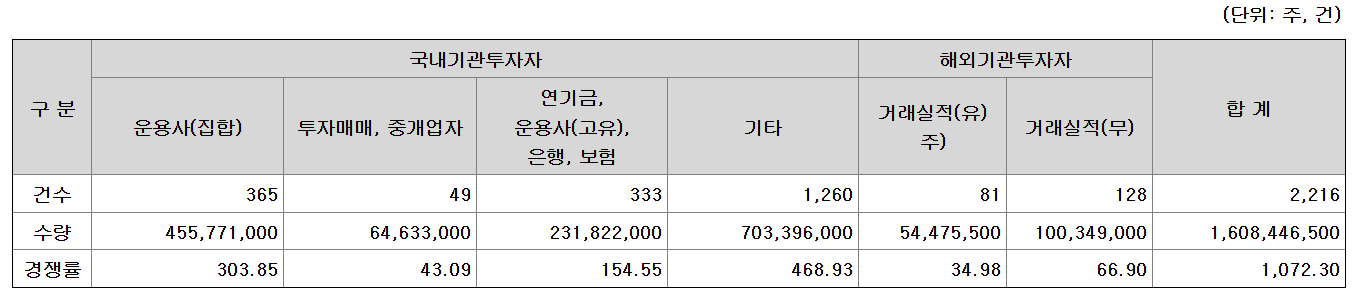 기관투자자 2,216 곳 참여 경쟁률 : 1,072.30 :1 |