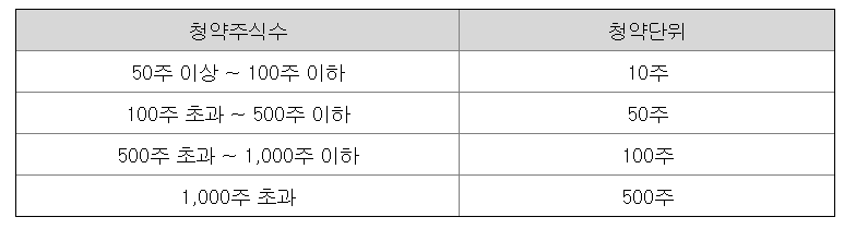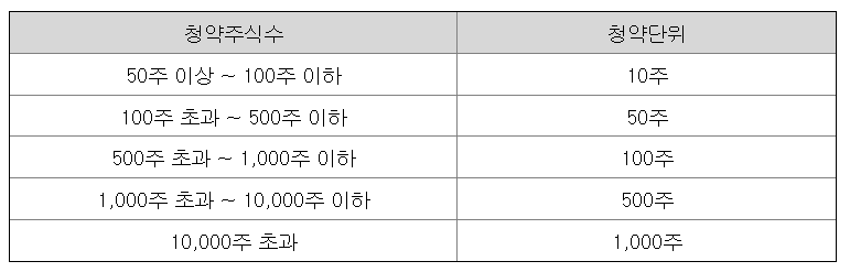 한국투자증권(주)의 청약 주식별 청약단위