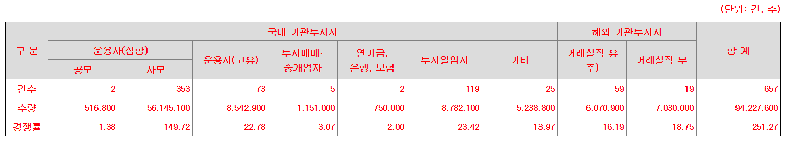 기관경쟁률 251.27 :1 기관참여 657곳 의무보유확약비율 0.42% |