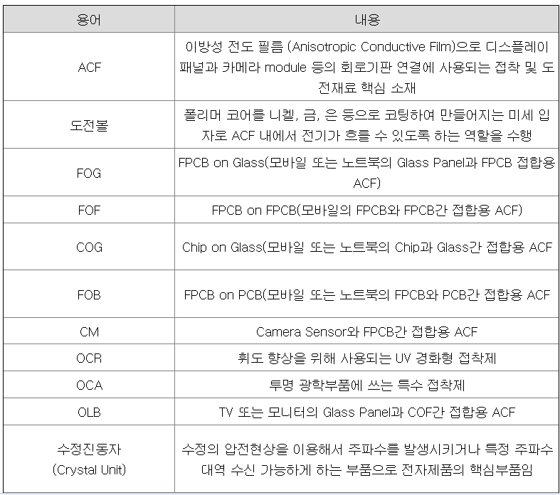 - 주요 제품 :ACF(이방성전도필름), 수정진동자 / 수정발진기