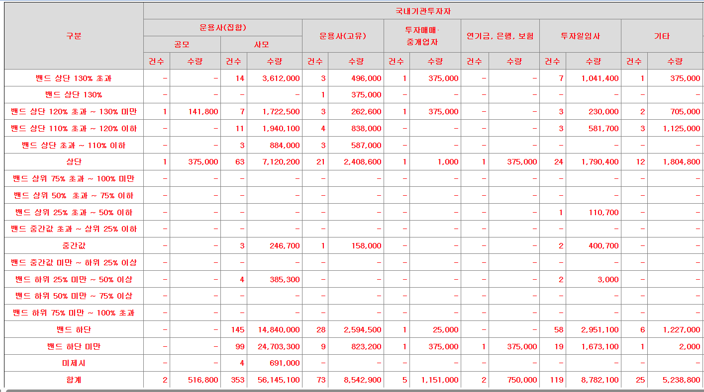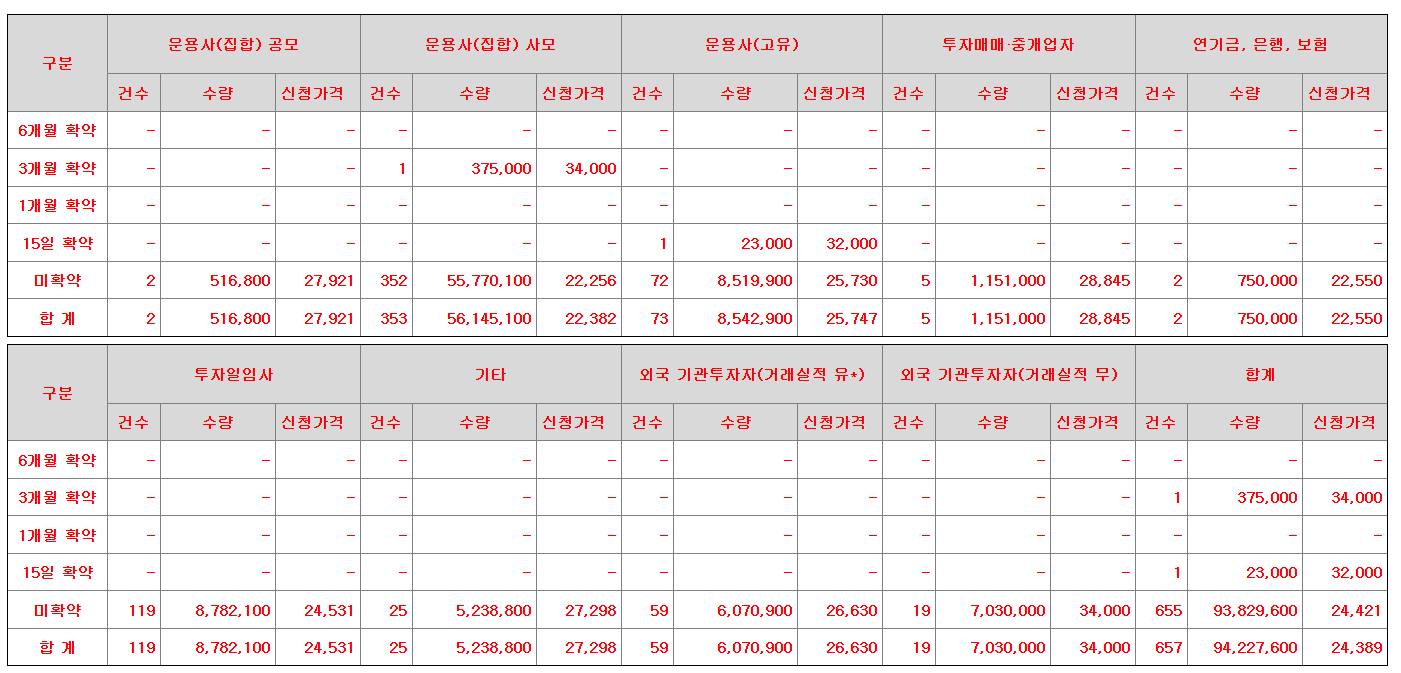 기관들의 신청가격은 공모가 밴드 하단인 22,000원 이하가 많았습니다.