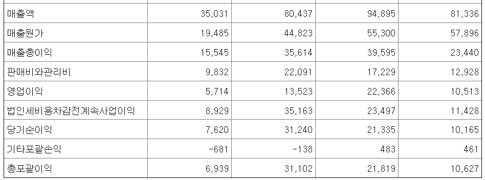 | 당기순이익 | 65억 | 301억 | 193억 | 102억 |