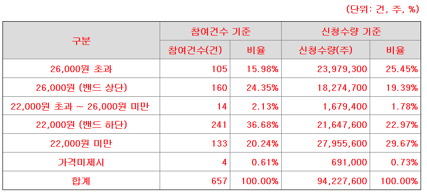 수량기준으로 52.64%가 공모가 밴드 하단인 22,000원 이하를 제시해서