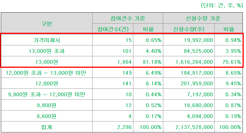 희망공모가 밴다는 8,600원 ~ 9,800원이었으나 많은 기관이 13,000원 상단 이상을 써내며 밴드 상단을