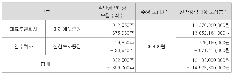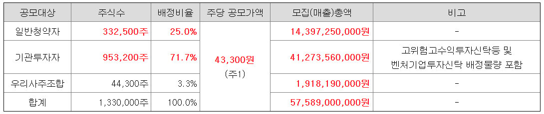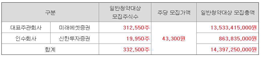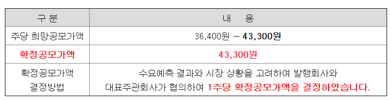 | 공모가 | 확정후 43,300 (전 36,400원 ~ 43,300) |