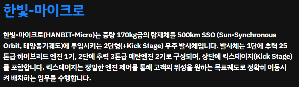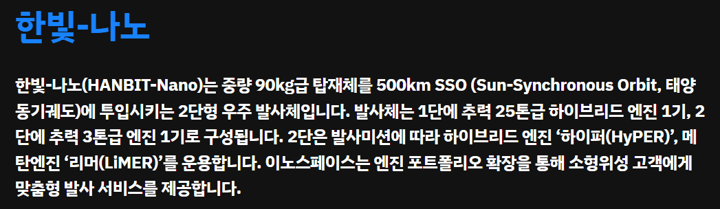 - 소형위성발사 : 하이브리드 로켓 기술을 사용하여 소형 위성을 지구 저궤도로 발사하는 서비스제공