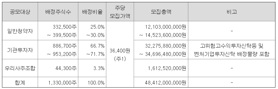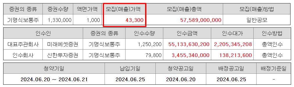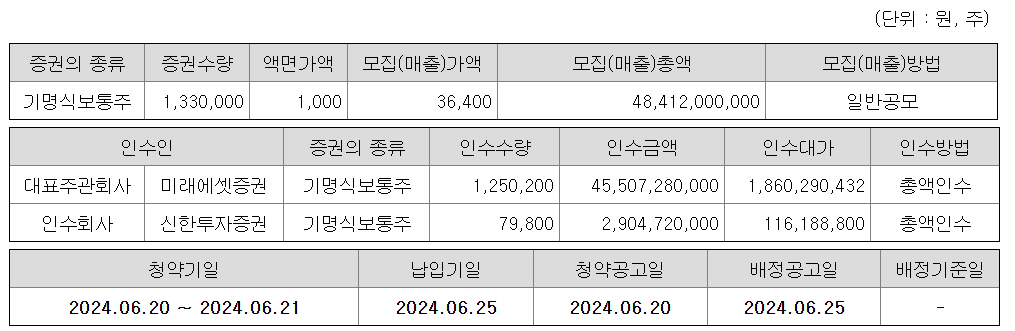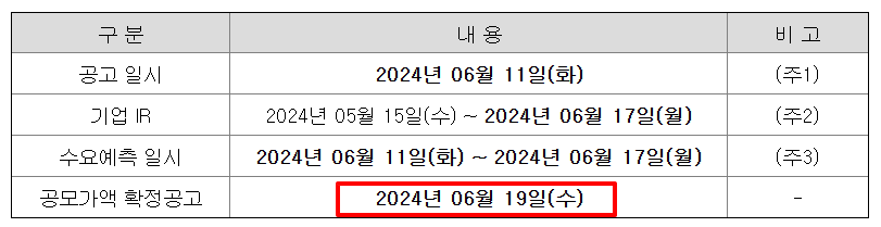 공모가액 확정공고 - 2024년 6월 19일 수요일. (확정되면 다시 수정해서 올리도록 하겠습니다.)