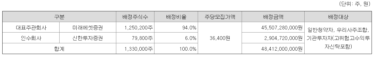 | 증권사 | 미래에셋증권 94% 신한투자증권 5% |