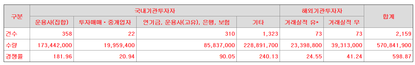 | 수요예측경쟁률 | 598.1 (2,159개 기관 참여) |