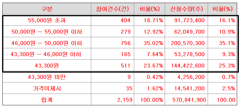 최상단 밴드 초과 신청이 70% 이상입니다. 최상단 초과는 안하고 43,300원으로 확정되었습니다.