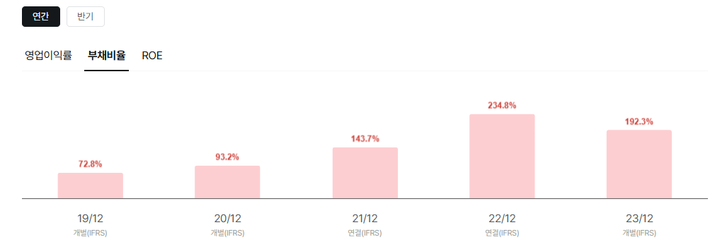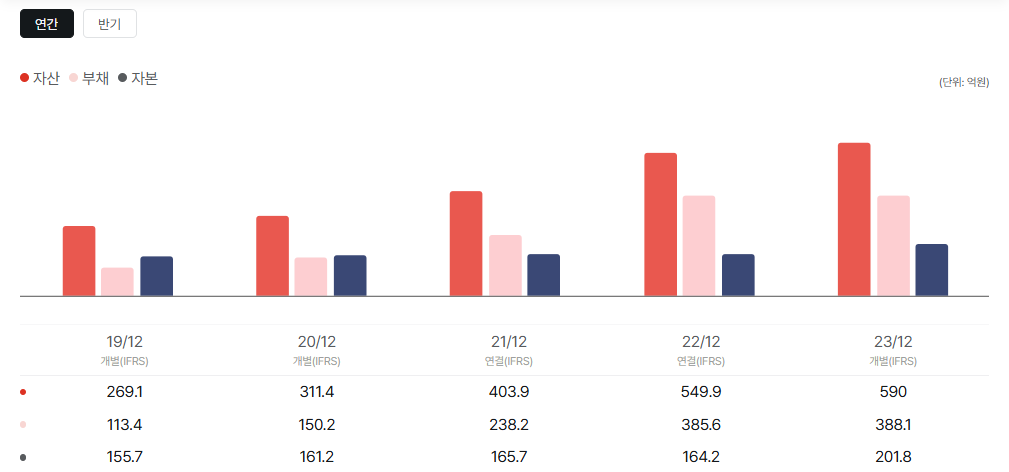 - 2023년 자산 590억원 / 부채 388억원 / 자본 201억원