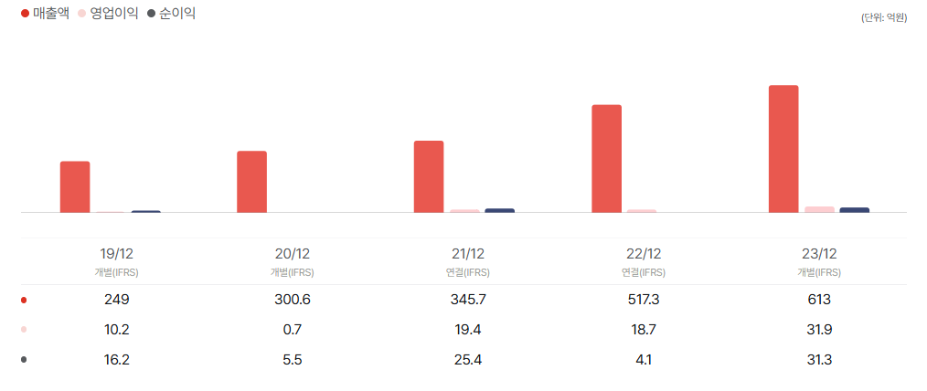 - 매출액 2021년 345억 / 2022년 517억 / 2023년 613억