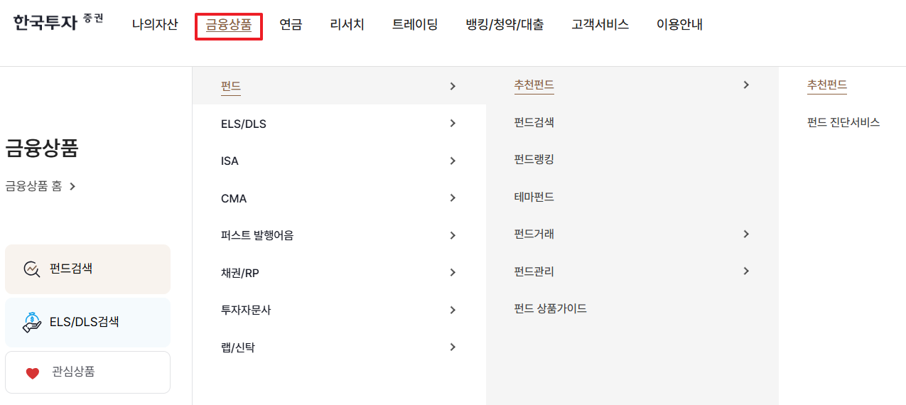 이 메뉴는 한국투자증권이 제공하는 모든 금융 상품을 확인할 수 있는 곳입니다.