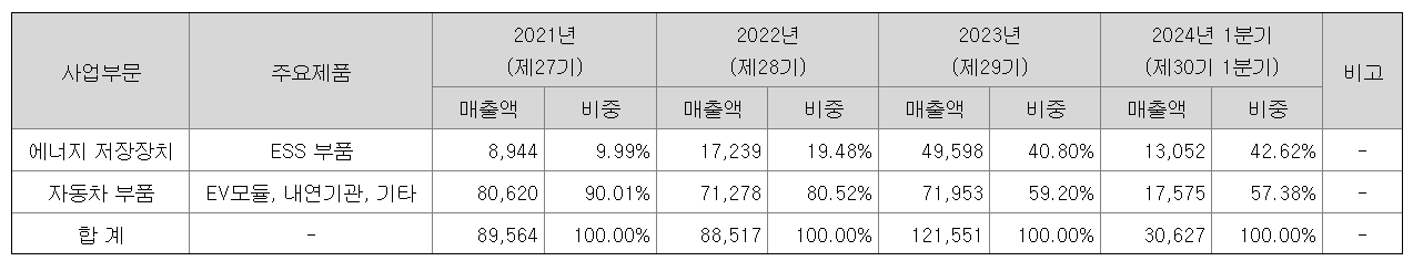 - 주요 제품 : 수랭식냉각시스템 ESS Parts, 공랭식 ESS Module , EV Module 및 내연기관 parts