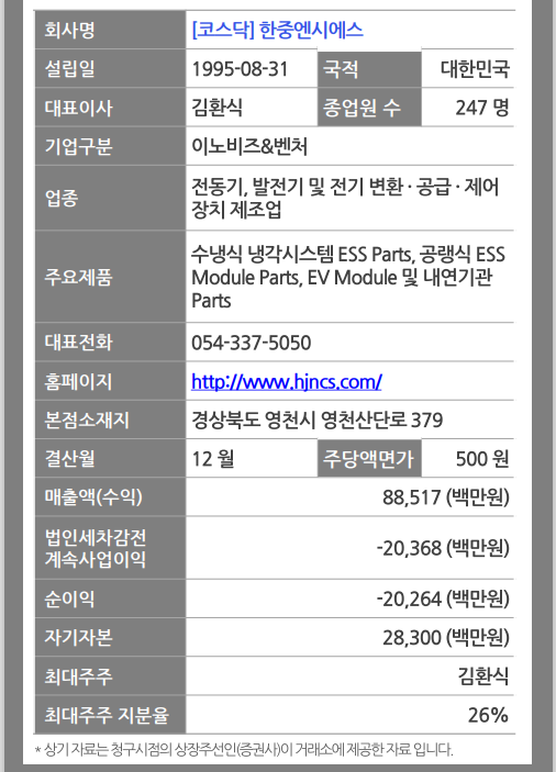 | 특징 | 자동차 부품(에너지 저장장치 ESS) 제조 |