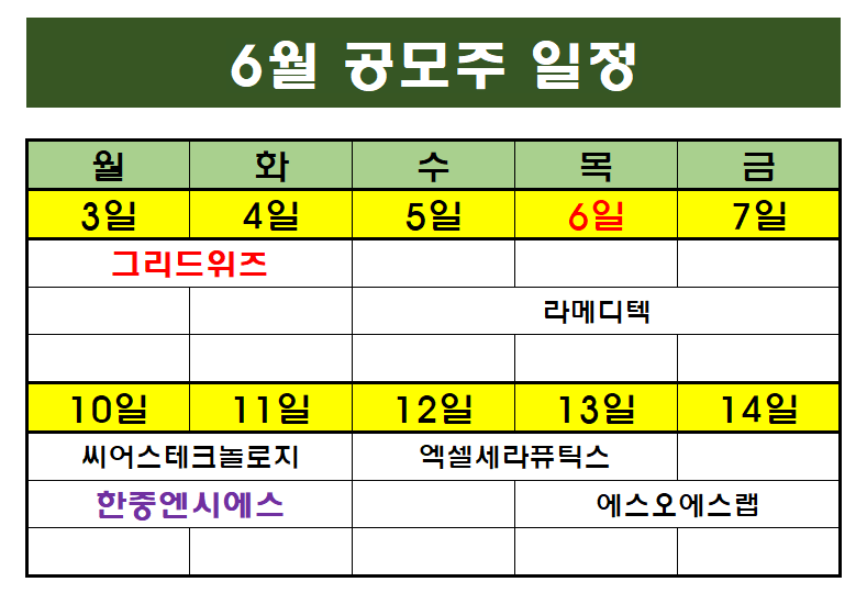 - 그리드 위즈 : 청약일정 6월 3일 ~4일 / 공모가 35,000원~ 40,000원 / 상장일 6월 14일 / 청약증권사 삼성증권