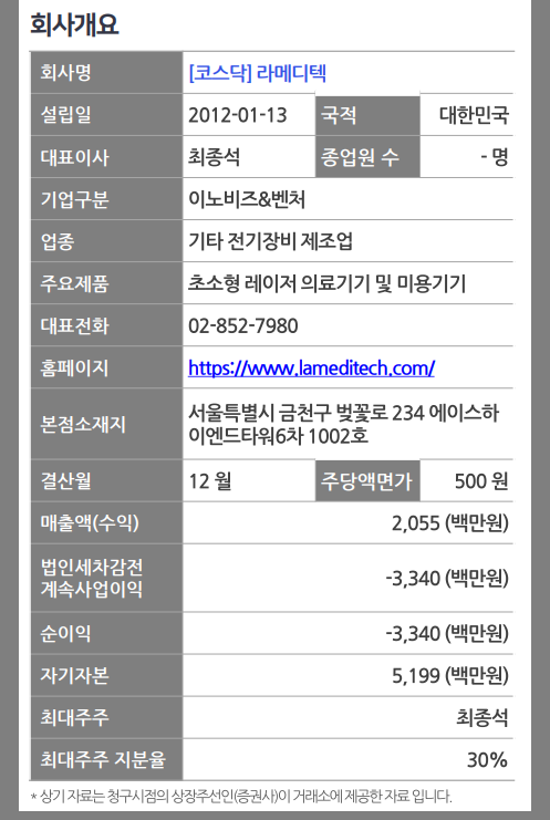 라메디텍은 초소형 고출력 레이저 기술을 기반으로 레이저 및 피부 미용 의료기기와 채혈기 관련 사업을 영위하는 회사입니다.