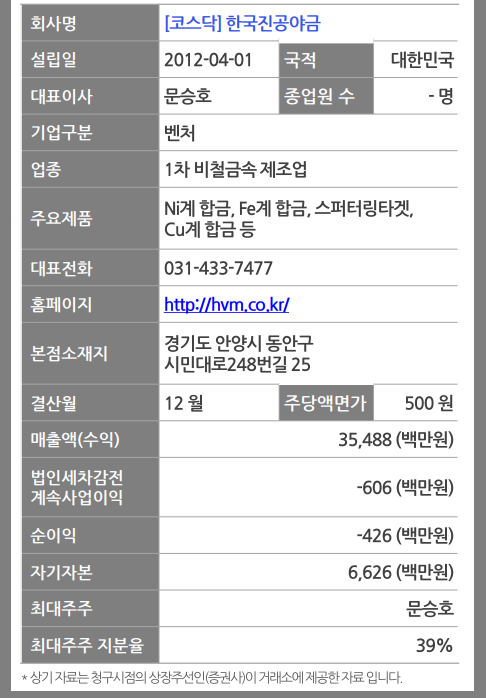 - 종목명 : 에이치브이엠 (구. 한국진공야금)