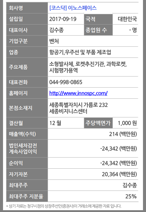 | 기업정보 및 특징 | 로켓제반 기술의 용역을 주력으로 하는 발사체 기업 |