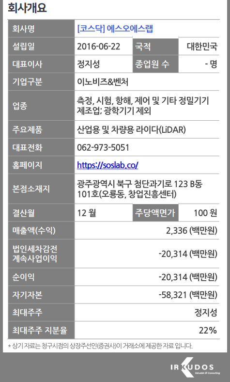 에스오에스랩은 레이저를 이용하여 주변 환경의 거리와 형태를 측정할 수 있는 센서인 라이다(LiDAR)의 개발, 제조 및 솔루션 기업으로 자동차, 로봇, 스마트 인프라 등 다양한 산업에 라이다 제품 및 관련 솔루션을 공급하는 회사 입니다.