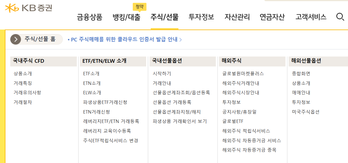 KB증권의 주식 및 ETF 메뉴는 국내외 주식과 상장지수펀드(ETF)에 쉽게 접근할 수 있도록 구성되어 있습니다. 이 메뉴에서 제공하는 주요 기능은 다음과 같습니다.
